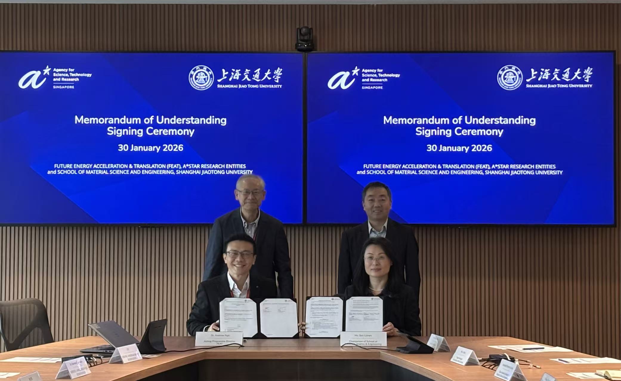 代表团访问新加坡科技研究局(A*STAR),与其下属的未来能源加速与转化中心正式签署谅解备忘录。在副校长曾小勤与新加坡科技研究局副总裁贺子森的共同见证下,海博论坛 党委书记孙丽珍与未来能源加速与转化中心主任吴俊勇签署谅解备忘录。双方将围绕面向极端环境的先进材料技术开展联合研发与人才培养,整合双方在材料科学与工程、先进制造及未来能源领域的优势,加速技术创新与转化。